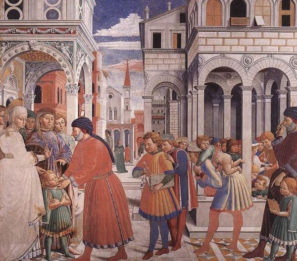 «Agustín en la escuela de Tagaste» pintado por Gozzoli. «En Cartago los estudiantes entraban alborotados y sin respeto en las aulas…» Confesiones V, 8.