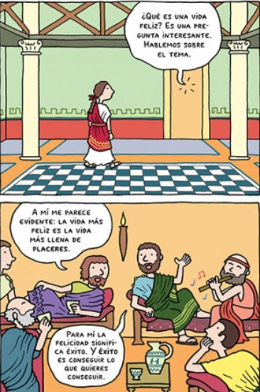 ¿Es compatible ser ético y a la vez querer tener éxito o gozar de placeres? Viñetas tomadas de La filósofa, el perro y la boda de Bárbara Stok, Salamandra, 2022, p. 15.