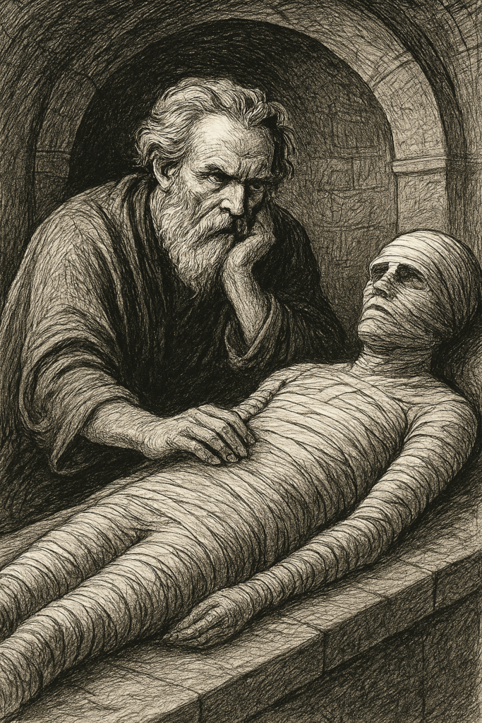 Moraleja del filósofo-momia: «Hay que deshacerse de los sentidos, del cuerpo (¡esa ‘idea fija’ asquerosa!) y del cambio. ¡Seamos momias intelectuales!»