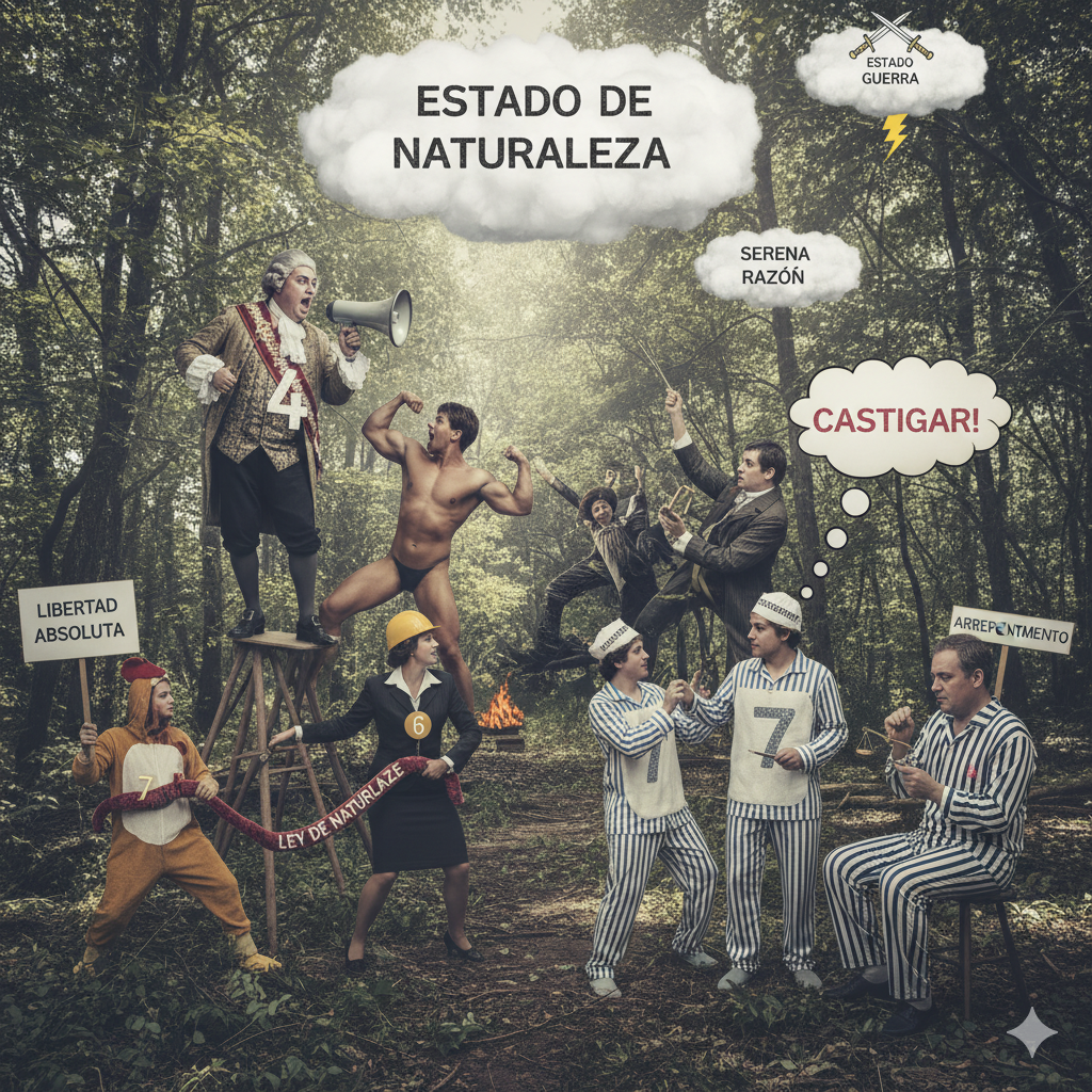 - Explicación sencilla: Vale, todos debemos respetar la ley de la razón, pero ¿qué pasa si alguien en la isla decide robar o atacar a otro? ¿Quién se encarga de hacer justicia si no hay policía ni jueces? Locke responde: TODOS. En el estado de naturaleza, todo el mundo tiene el derecho y el deber de hacer cumplir la ley natural. Si alguien rompe esa ley, se convierte en un peligro para todos, y cualquiera puede «ejecutar la ley», es decir, castigarlo. Pero este poder no es absoluto ni vengativo. No puedes torturar a alguien por robarte un coco. El castigo debe seguir dos principios racionales: